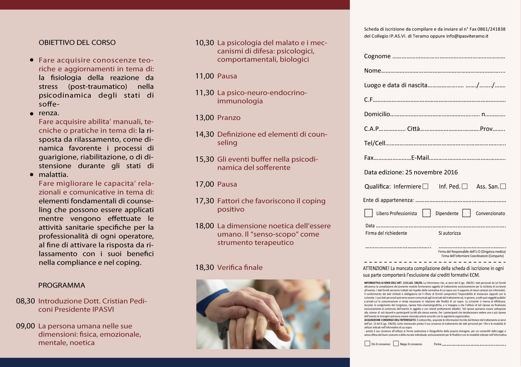 Il Collegio OPI di Teramo è lieta di presentarvi i due eventi formativi che si terranno rispettivamente, il 25 novembre a Teramo presso l’Aula Convegni II lotto P.O. dal titolo “L’umanizzazione delle cure in ambito sanitario, strategie di relazione e comunicazione per operatori della salute” e il 26 novembre ad Atri presso l’Auditorium S.Agostino, Corso Elio Adriano dal titolo “L’ascolto attivo della narrazione della sofferenza dei malati e dei care-givers:i segni della lo guarigione integrale”