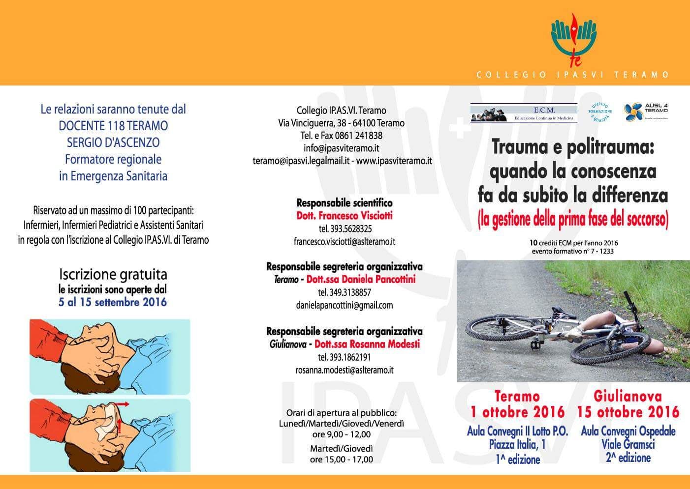 L'evento si terrà a Teramo il 1 Ottobre 2016 presso l'Aula Convegni II Lotto P.O. Piazza Italia 1, e si ripeterà a Giulianova il 15 Ottobre 2016 presso l'Aula Convegni Viale Gramsci.