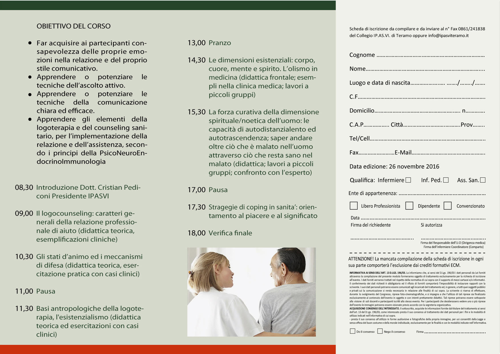 Il Collegio OPI di Teramo è lieta di presentarvi i due eventi formativi che si terranno rispettivamente, il 25 novembre a Teramo presso l’Aula Convegni II lotto P.O. dal titolo “L’umanizzazione delle cure in ambito sanitario, strategie di relazione e comunicazione per operatori della salute” e il 26 novembre ad Atri presso l’Auditorium S.Agostino, Corso Elio Adriano dal titolo “L’ascolto attivo della narrazione della sofferenza dei malati e dei care-givers:i segni della lo guarigione integrale”