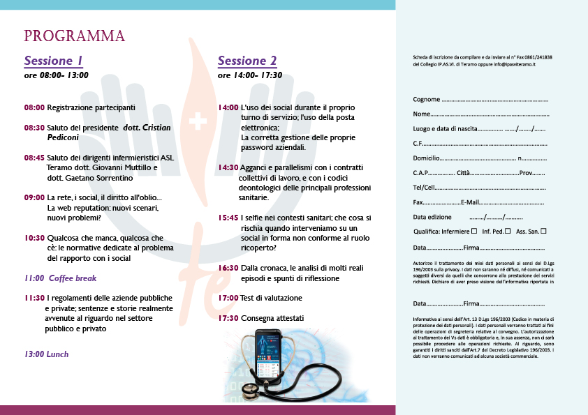 Iscrizioni gratuite dal 13 al 24 Aprile 2017 e riservato ad un massimo di 95 partecipanti in regola con l'iscrizione al Collegio OPI di Teramo.